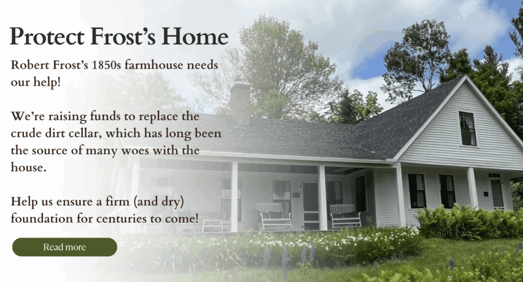 The Frost Place is a museum and center for poetry based at Robert Frost’s former Franconia farmhouse, operated by the nonprofit organization Friends of the Frost Place. This humble home was built in the 1860s, and like all old homes, it requires quite a lot of love and skilled attention! Donations are used to maintain the house and its programs. We deeply appreciate your generosity.